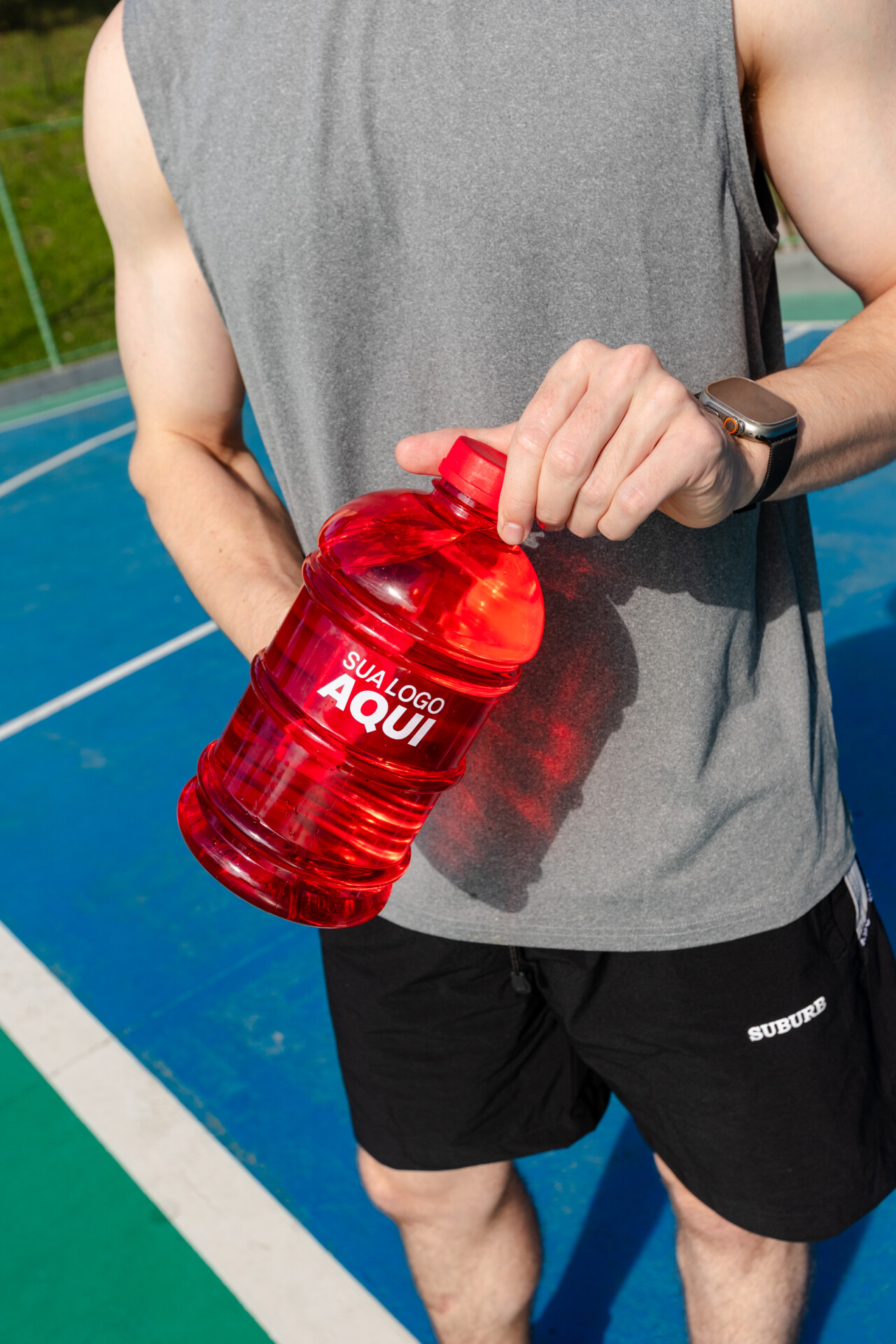 Galão 2000ml (com alça) em plástico PET, livre de BPA. Alça externa ergonômica e que não acumula resíduos. Produto super resistente, durável e disponível em diversas cores. Ideal para empresas, academias, brindes e eventos.